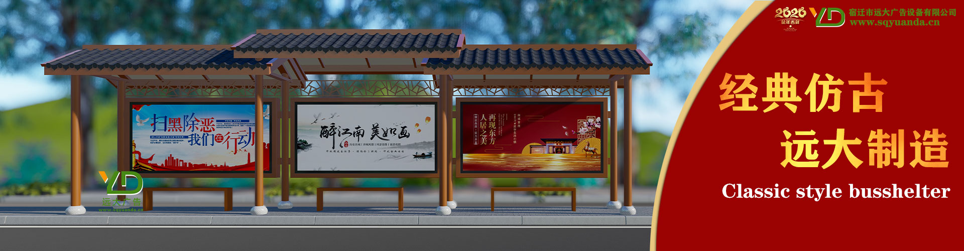 宿遷市遠(yuǎn)大廣告設(shè)備有限公司是一家專業(yè)生產(chǎn)公交候車亭,公交站臺,閱報(bào)欄,指路牌,廣告垃圾箱,滾動(dòng)換 畫燈箱等系列產(chǎn)品廠家!產(chǎn)品多達(dá)上百種,亦可根據(jù)客戶的需求加工制作。